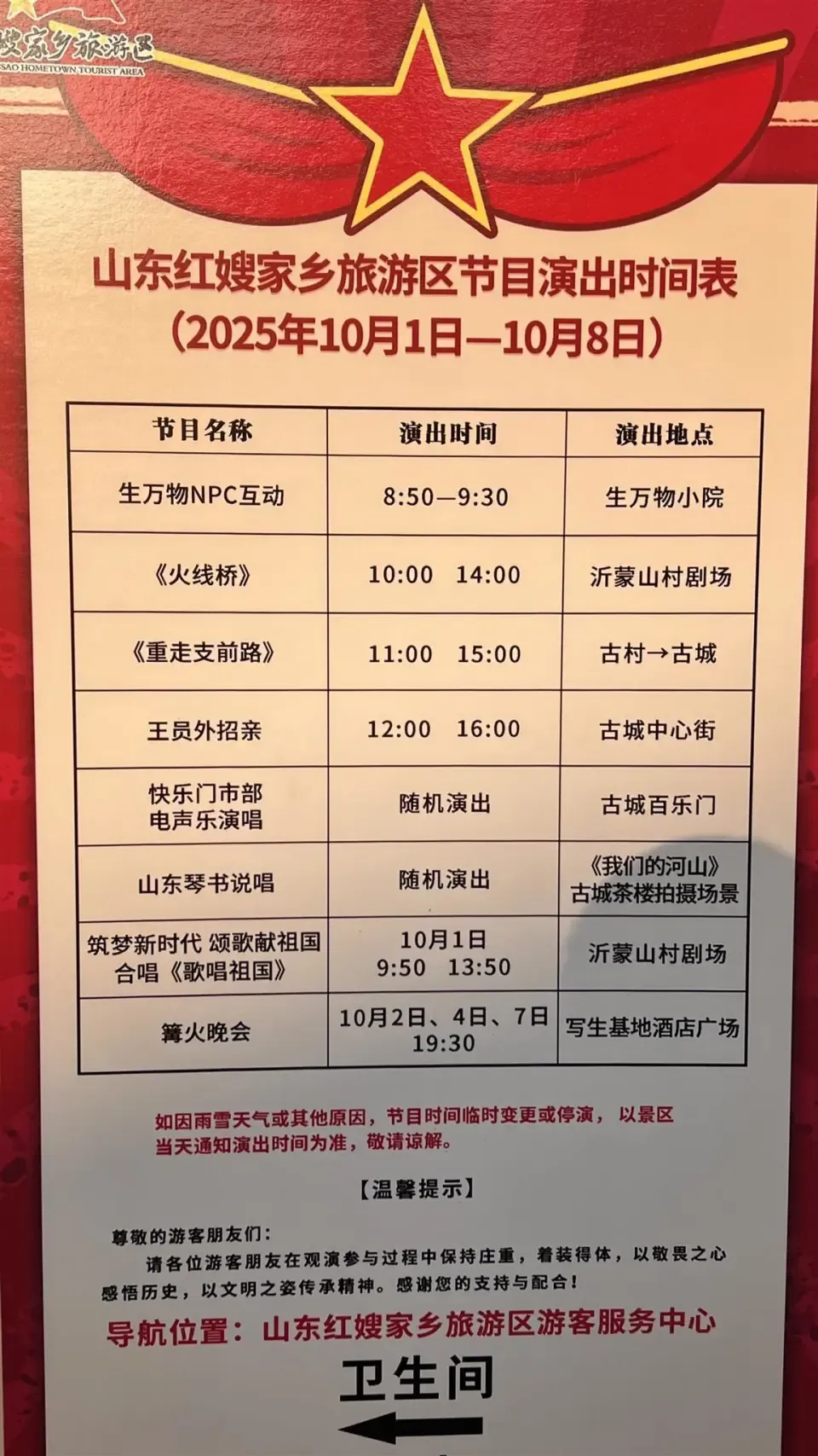 10月1日至8日日赢配资,《重走支前路》演出时间为11时、15时。如因天气等原因变更演出时间或停演,以景区当天通知的演出时间为准。