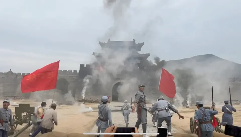 10月1日上午11时,穿着粗布衣裳的“村民”,带领数百名游客在操场前集结,在《沂蒙颂》歌曲声中,背负着一箱箱手榴弹和粮食,步行前往“战场”前线,城下的“战士”匍匐在战壕前,早已摩拳擦掌。突然,城墙上闪现火光,耳边传来轰鸣声,接着燃起黑烟,总攻开始了。一名战士冲出战壕,吹响冲锋号,十多位演员紧接着高高跃起。游客立马跟上,冲向城墙,不自觉地呼喊着口号冲锋向前,不多久,城门就被打开……胜利了!