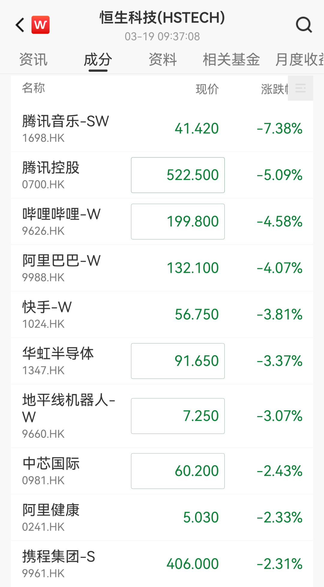 恒生指数开盘跌1.82%,恒生科技指数跌2.1%,有色金属、科网股领跌,热门科技股普跌,腾讯控股跌超5%,去年资本开支创新高。哔哩哔哩、阿里巴巴跌超4%,智谱、快手跌超3%,小鹏汽车、蔚来、京东集团跌超2%。